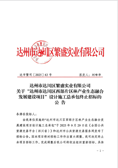 达州市达川区繁盛实业有限公司关于“达州市达川区西部片区林产业生态融合发展建设项目”设计施工总承包终止招标的公告