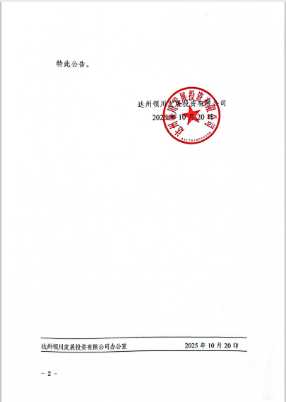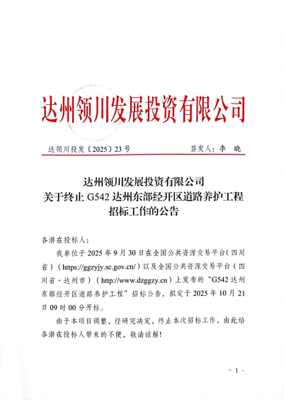 达州领川发展投资有限公司关于终止G542达州东部经开区道路养护工程招标工作的公告