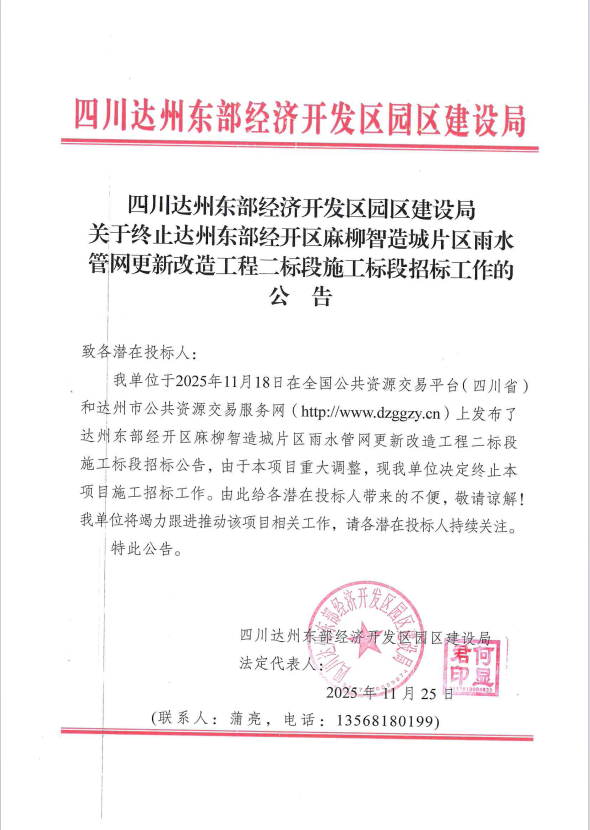 四川达州东部经济开发区园区建设局关于终止达州东部经开区麻柳智造城片区雨水管网更新改造工程二标段施工标段招标工作的公告