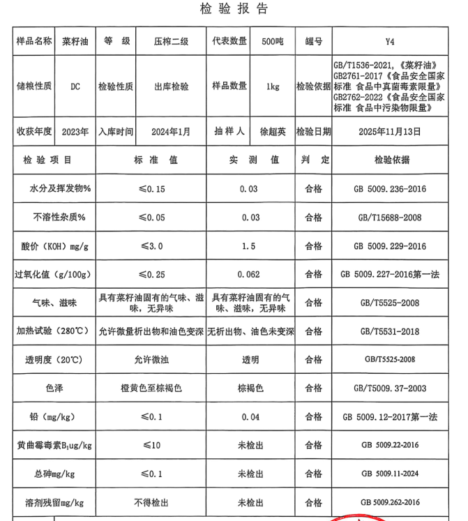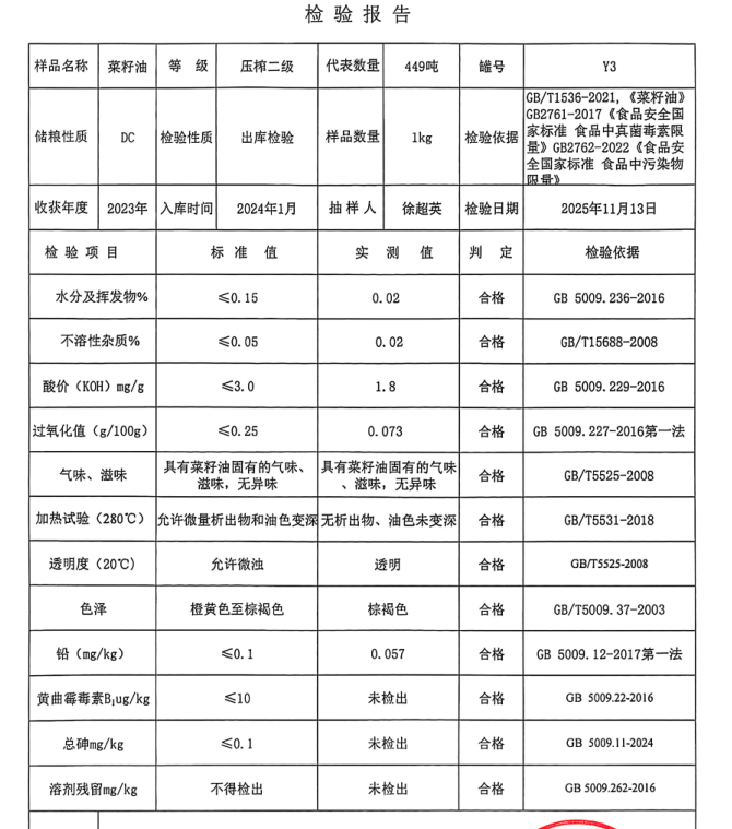 5.其他要求: 入库时卖方提供该批菜籽油第三方检验资质机构出具的检验报告;供货方对菜籽油产地和生产年份(2025年)的真实性负责,并提交标的物产地证明书。证明书中内容包含但不限于品种、产地、年限等;