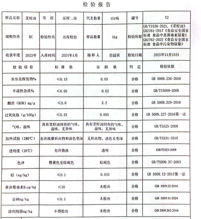 1.质量要求:必须是2025年产新加工生产的非转基因菜籽油,质量指标符合菜籽油国家标准(GB/T1536-2021)二级及以上要求,食品卫生指标符合国家食品卫生安全要求,其中:酸价(K0H计)(mg/g)≤1.0; 过氧化值g/100g≤0.13:溶剂残留<20mg/kg,黄曲霉B1≤8ug/kg,铅<0.08mg/kg;塑化剂必须符合国标准;不得掺加其他食用油和非食用油;除约定质量要求外,其他指标符合国家相关标准和食品安全标准.以上各项指标超标拒收。拒收菜籽油由竞得方自行处理,并承担由此产生的一切费用。
