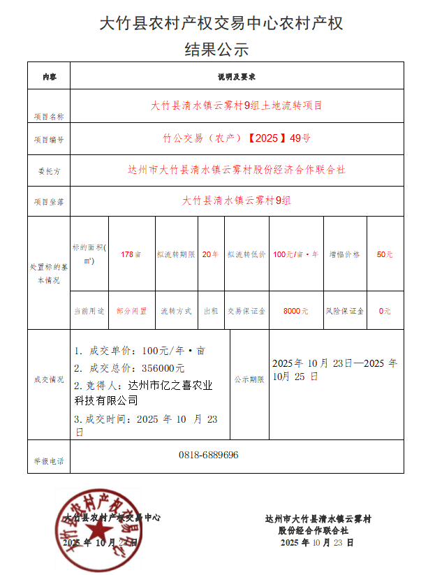 大竹县清水镇云雾村9组土地流转项目结果公示