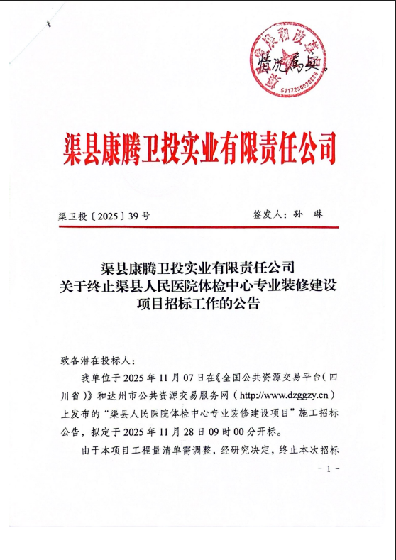 渠县康腾卫投实业有限责任公司关于终止渠县人民医院体检中心专业装修建设项目招标工作的公告