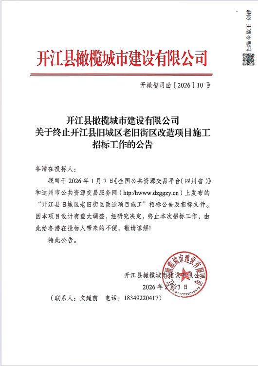 开江县橄榄城市建设有限公司关于终止开江县旧城区老旧街区改造项目施工招标工作的公告