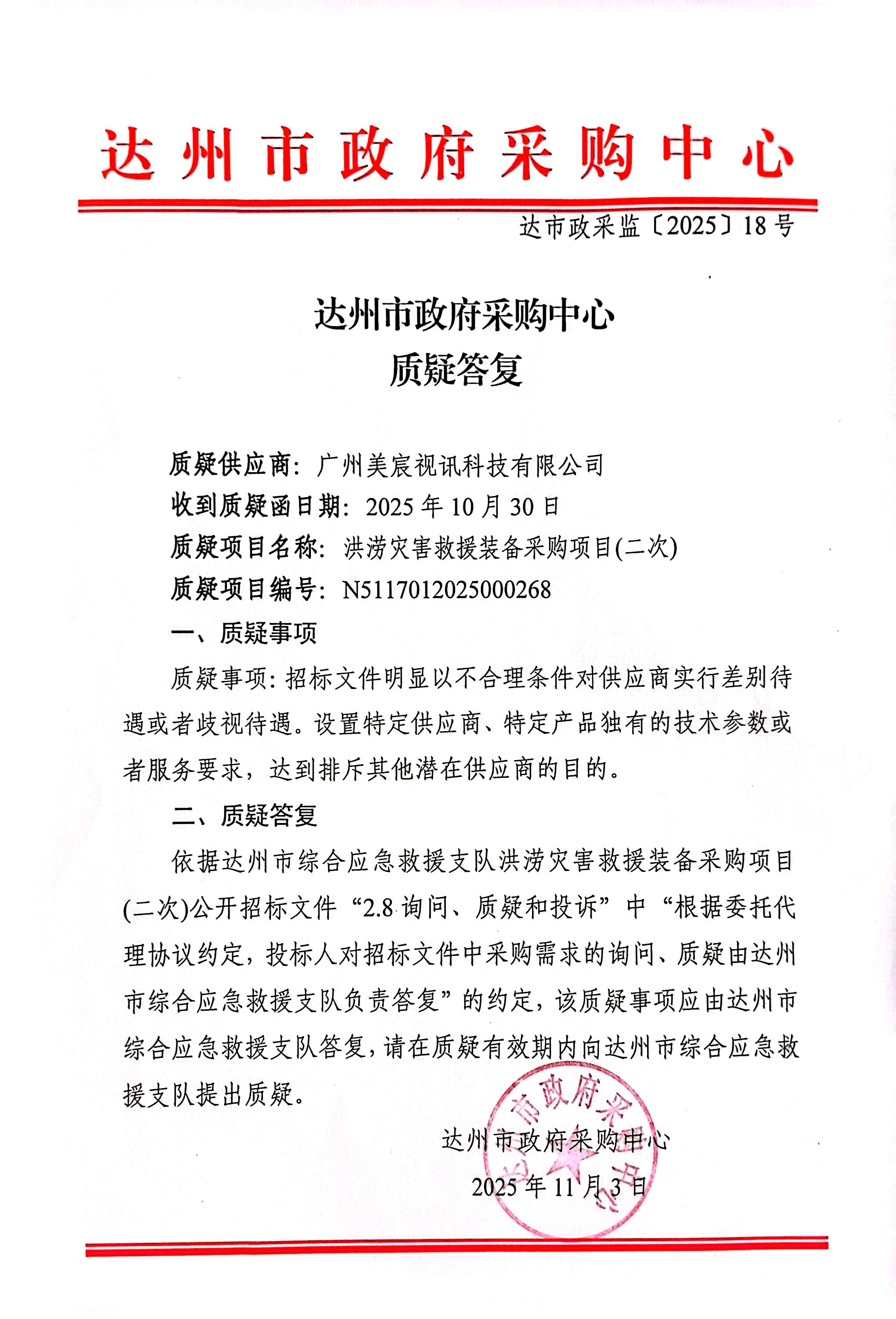 达州市综合应急救援支队洪涝灾害救援装备采购项目(二次)质疑答复