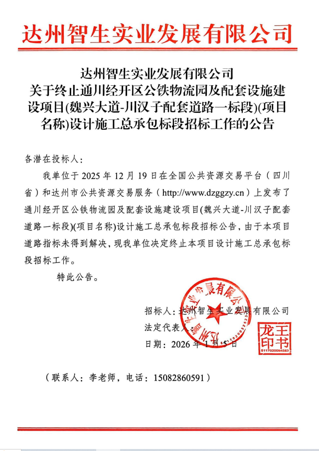 达州智生实业发展有限公司关于终止通川经开区公铁物流园及配套设施建设项目(魏兴大道-川汉子配套道路一标段)(项目名称)设计施工总承包标段招标工作的公告