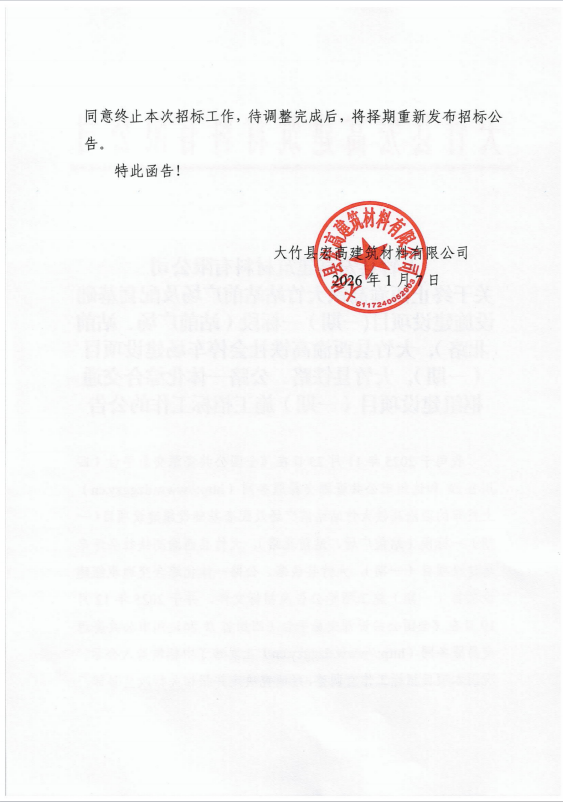 大竹县宏高建筑材料有限公司关于终止西渝高铁大竹站站前广场及配套基础设施建设项目(一期)一标段(站前广场、站前北路),大竹县西渝高铁社会停车场建设项目(一期),大竹县铁路、公路一体化综合交通枢纽建设项目(一期)施工招标工作的公告