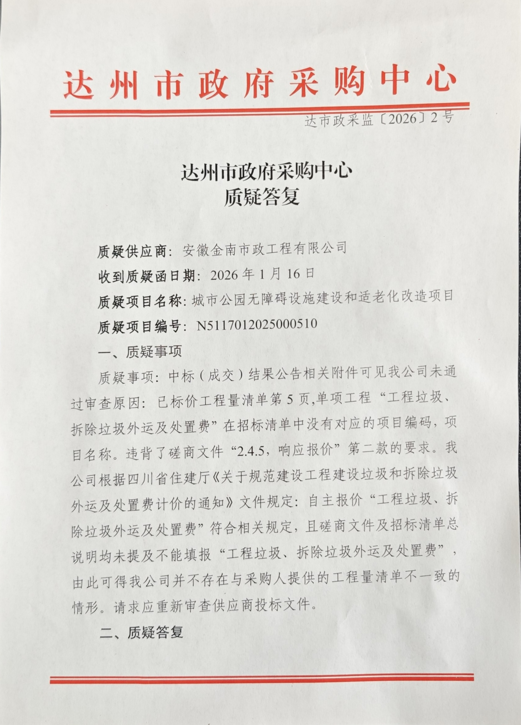 城市公园无障碍设施建设和适老化改造项目质疑答复