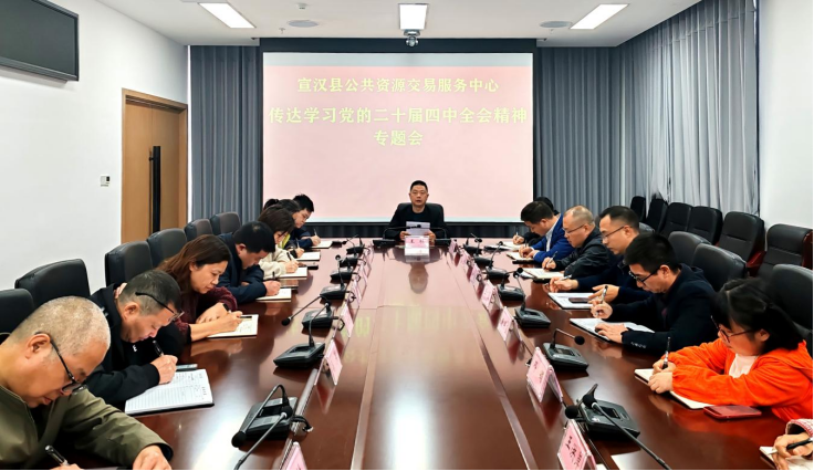 11月4日上午,县公共资源交易服务中心召开专题会议,传达学习党的二十届四中全会精神,并结合中心工作实际,研究部署贯彻落实举措。会议旨在引导全体干部职工深刻领会全会精神的重大意义、核心要义和实践要求,切实将学习成果转化为推动公共资源交易工作高质量发展的强大动力和实际成效,为宣汉“百强晋位、冲刺千亿”贡献公共资源交易力量。